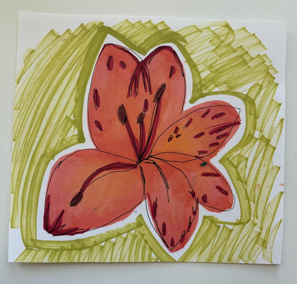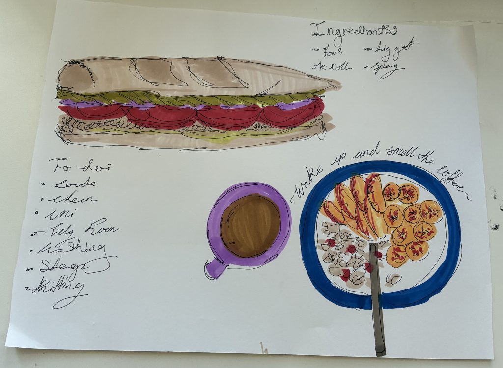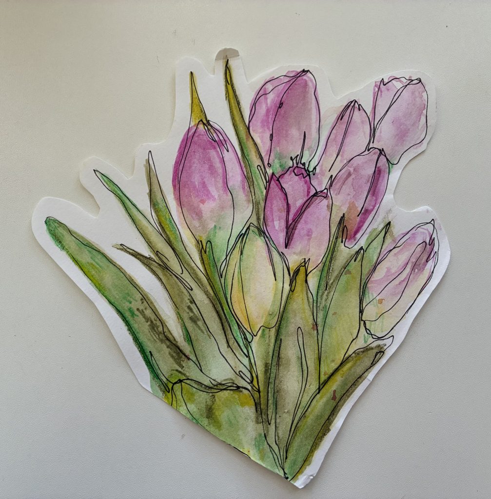 To explore London’s colours I have focused on those in my day-to-day life: my bedroom, ingredients, walks/cycles and flowers. I used varied materials such as pastels, paints and markers to find texture and colour in my subjects. The continuous line in combination with the watercolour of the tulips stands out to me as an illustration. The colours of the flower gently blend and are refined by the singular line from the pen. I enjoyed illustrating the food in my fridge as this was a new subject for me to draw and showed some vivid new colours. In future I would like to develop more mixed media pieces and explore a range of inspirations.