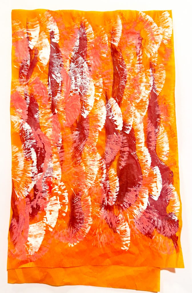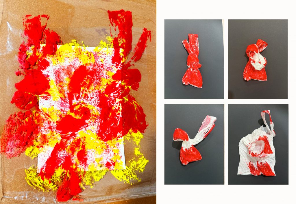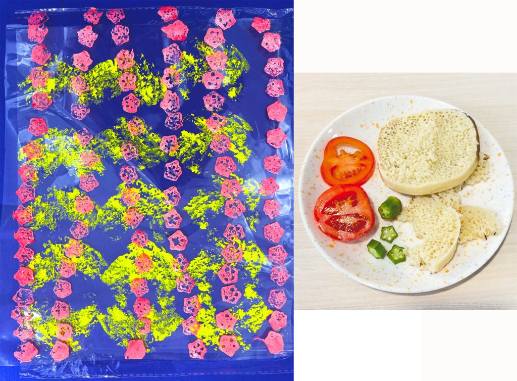 [Print works using tomato slices, crumpets, and okra slices with acrylic paints on plastic sheets.]