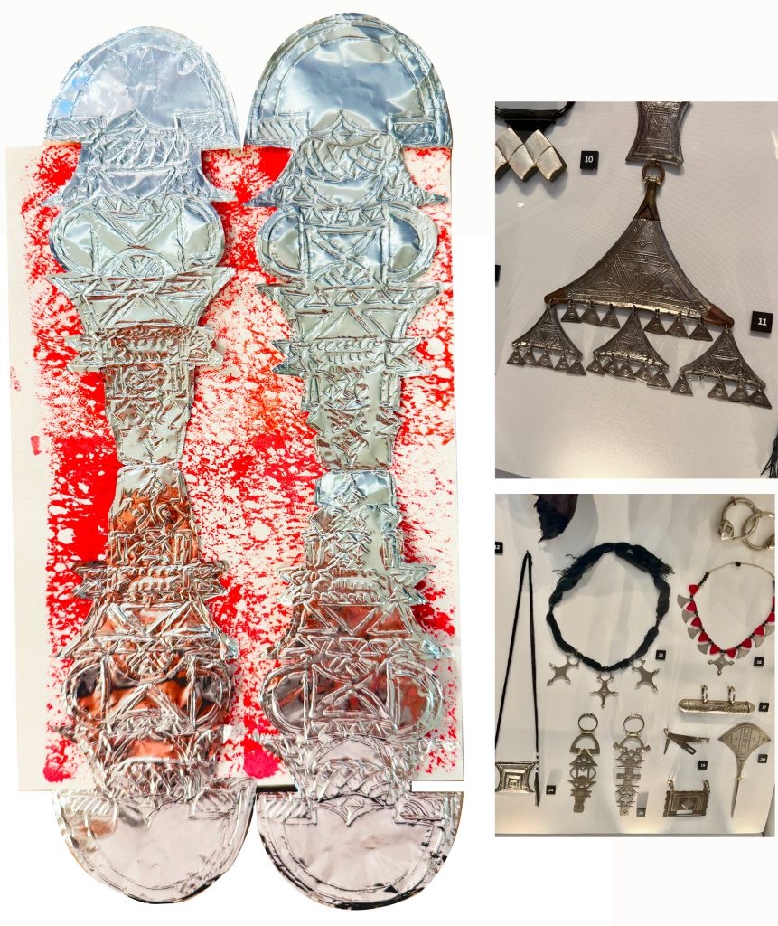 [Drawings on tin foil inspired by African Tuareg necklace from the offsite visit to the Horniman Museum.]