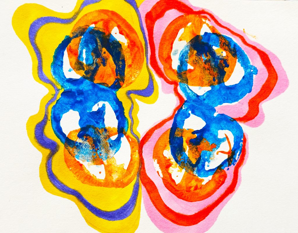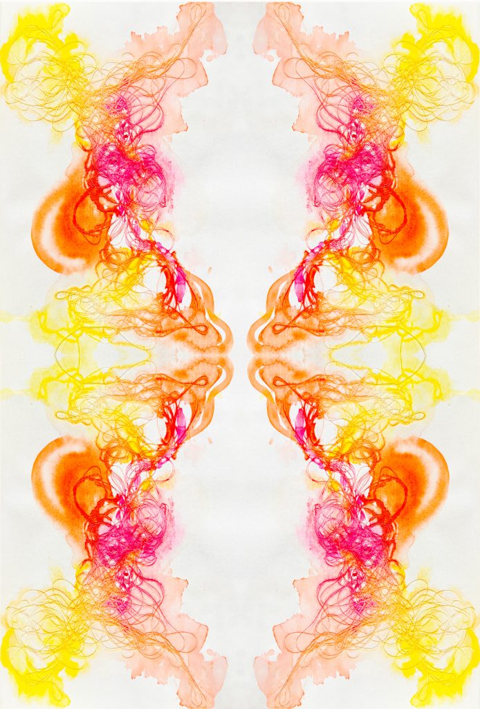 [Symmetric Flowers, using yellow ink as base, print marks with water colors.]