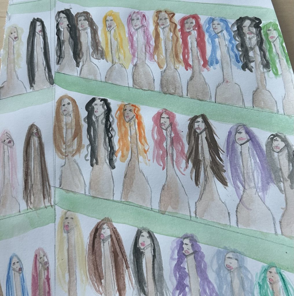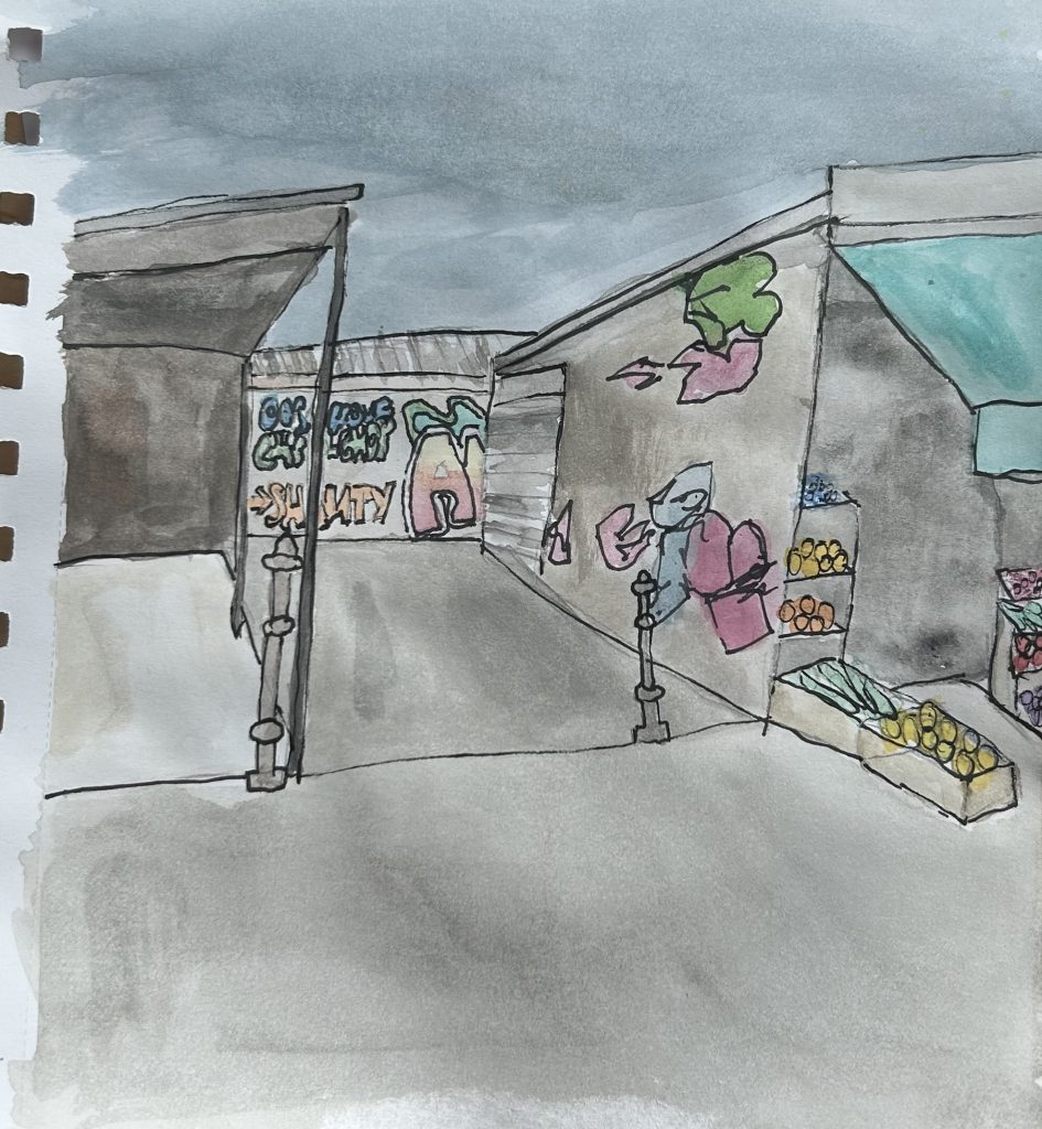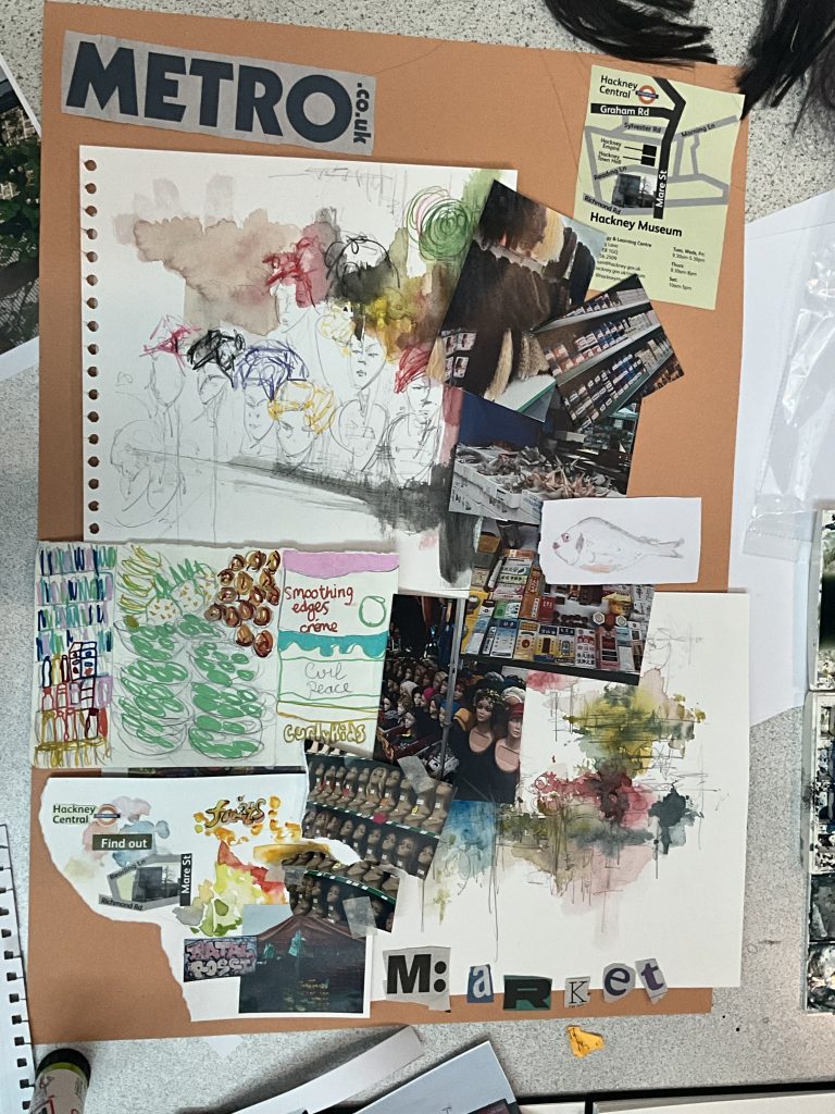 This process led me to create a series of drawings inspired by Dalston Market and London Fields, two places full of character and energy. I was drawn to the vibrant displays of fruit in the markets, the diversity of haircare shops, and the fast-paced, buzzing atmosphere that defines these areas. Experimenting with a wide range of colours, materials, and locations encouraged me to step outside my comfort zone and broaden my creative perspective. Through this exploration, I have developed a deeper understanding of how to use my techniques to express atmosphere and emotion, something I hope to continue building on in future projects.