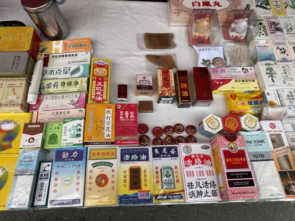 Over there, there are many wig and fruits stalls, and there is also a stand Chinese miracle drugs.